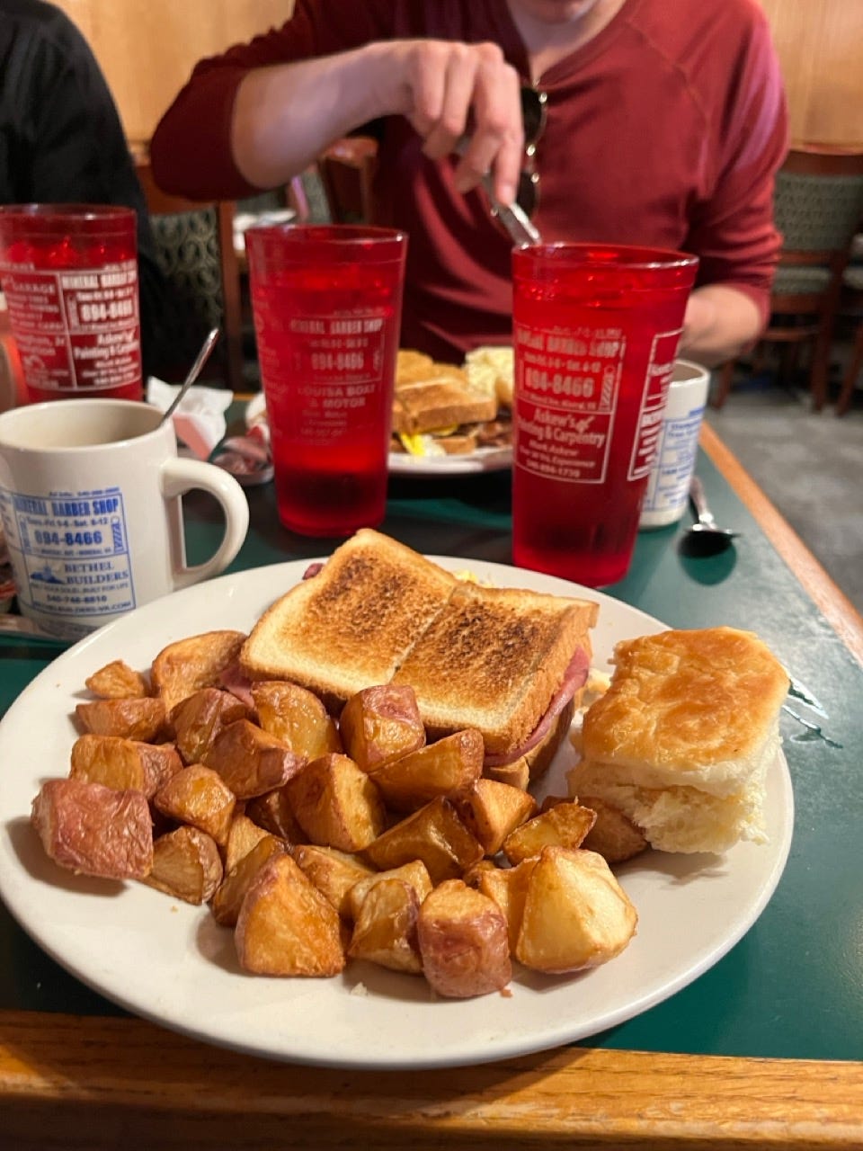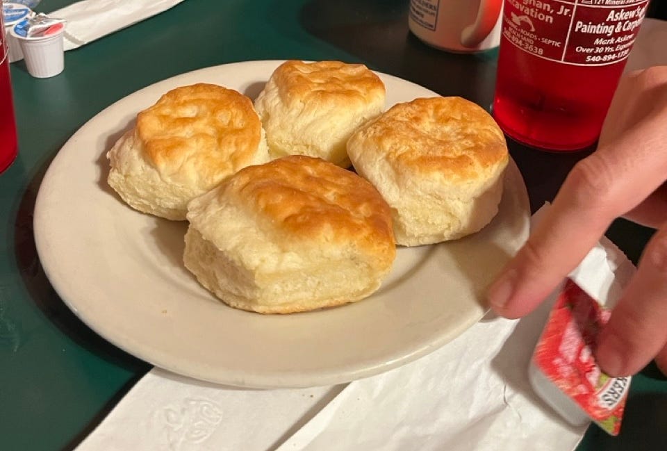 The waitress grabbed that basket, and then proceeded to clean off an adjacent table with another basket, so by the time it was all said and done, it was a whole “Jesus multiplying the loaves and fishes” type moment, with four warm biscuits sitting right in front of us where none had been just moments before. Who knew such miracles could occur in rural Virginia? Turns out you can try that in a small town.